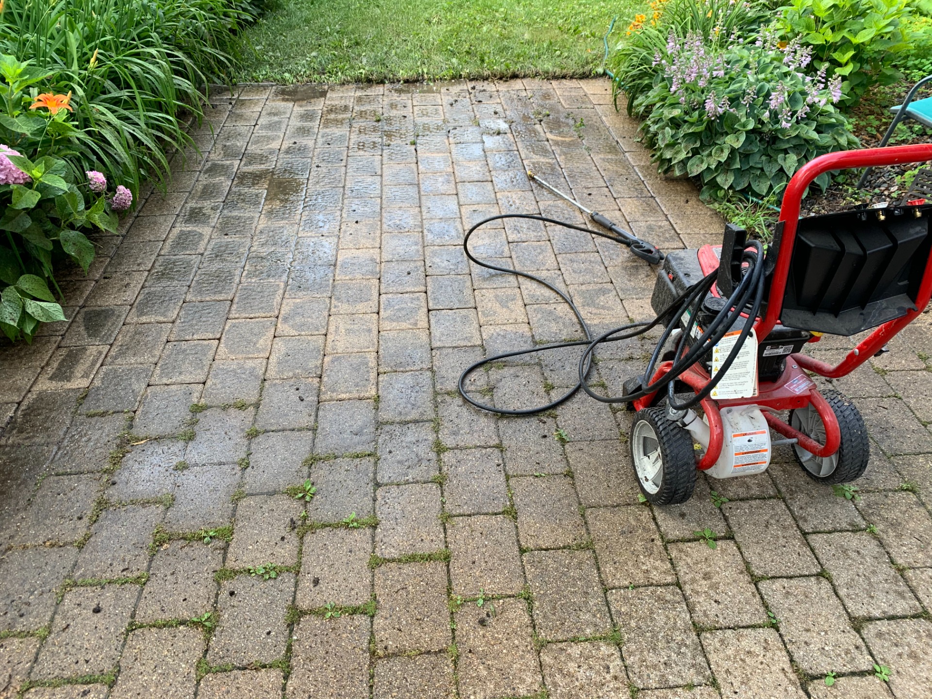 power washing patio bricks, garages, sidewalks, driveways, walls and siding.